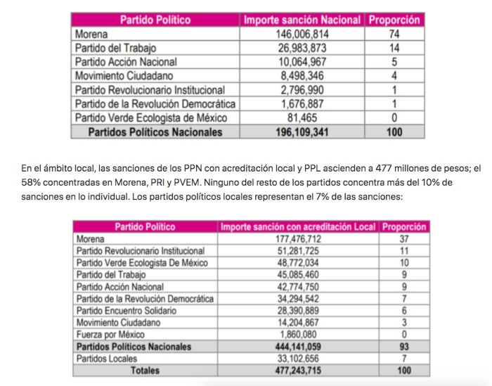 Según el INE, entre las infracciones cometidas por Morena destacan la omisión de reportar gastos de propaganda en la vía pública por concepto de bardas, carteleras, espectaculares en pantallas digitales, mantas, lonas, y vinilonas medios de transporte público, por lo que la Comisión de Fiscalización calificó esta falta como grave ordinaria, imponiendo así una multa por 10 millones 877 mil pesos.