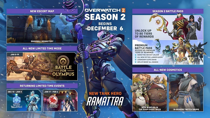 Estamos a pocos días de que la temporada número 2 llegue de manera oficial, esta incluye un nuevo personaje en el apartado de tanques, Ramattra, un nuevo mapa, un modo de juego por tiempo limitado, algunos eventos ya conocidos que regresan como la festividad de invierno y el Año Nuevo Chino, además, de las adiciones más importantes que son nuevos cosméticos y un nuevo pase de batalla con mucho contenido por desbloquear.