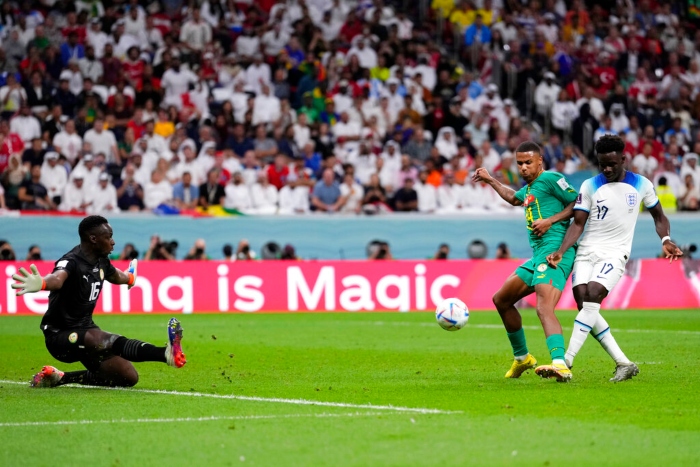 Bukayo Saka anota el tercer gol de Inglaterra en la victoria 3-2 contra Senegal por los octavos de final del Mundial, el domingo 4 de diciembre de 2022, en Jor, Qatar. Foto: Manu Fernández, AP.