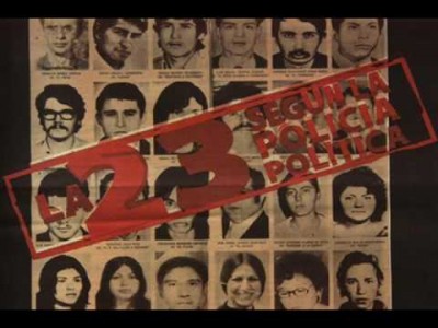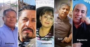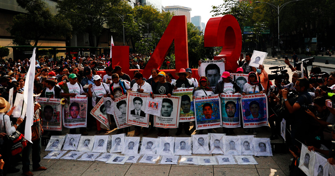 Familiares de los 43 estudiantes de magisterio desaparecidos sostienen carteles con fotos de sus seres queridos mientras protestan en el quinto aniversario de la desaparición de los jóvenes frente a un monumento en su memoria en Ciudad de México el jueves 26 de septiembre de 2019. Foto: Marco Ugarte, AP Photo