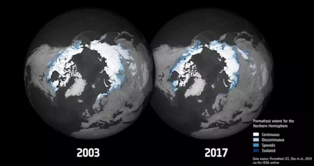 Según el último informe especial del Grupo Intergubernamental de Expertos sobre el Cambio Climático, las temperaturas del permafrost han aumentado hasta niveles récord desde la década de 1980 hasta la actualidad. Como consecuencia, crece la preocupación de que se puedan movilizar cantidades significativas de gases de efecto invernadero en las próximas décadas a medida que se descongele y potencialmente amplifique el cambio climático, de acuerdo con el informe de febrero de 2020 de la Agencia Espacial Europea (ESA).