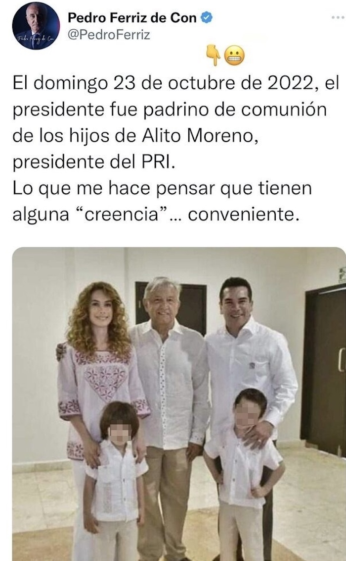 Fue Ferriz de Con quien publicó el tuit en el que se aseguró que la fotografía fue capturada el pasado 23 de octubre durante la celebración de la Primera Comunión de los hijos de Alito Moreno, lo que enseguida levantó críticas de usuarios de redes sociales en contra del comunicador.