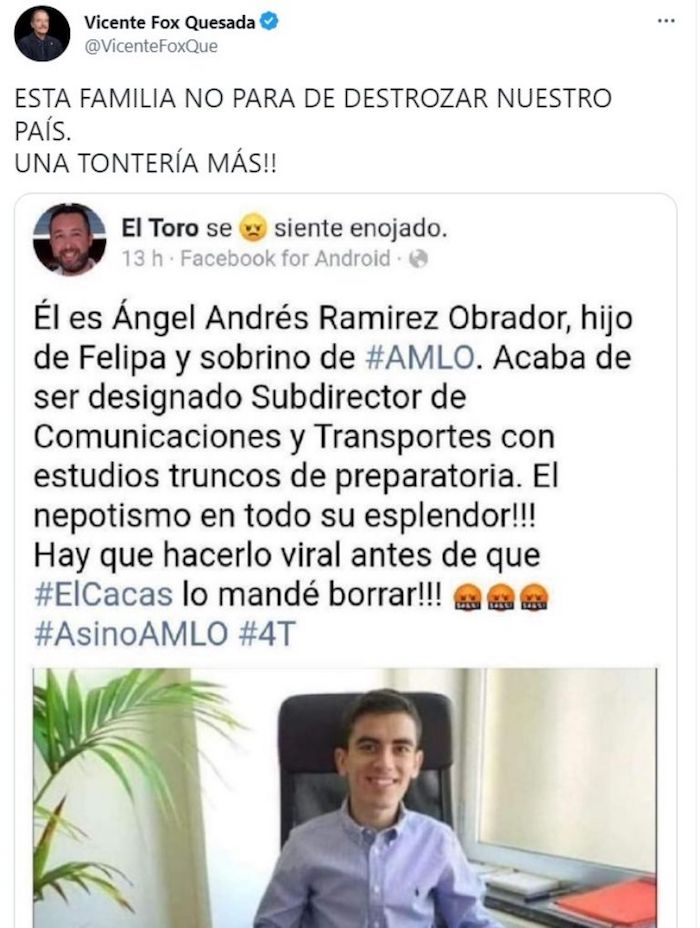 Sin embargo, el exmandatario no corroboró dicha información y cayó en una fake news, ya que, además, de que la noticia era falsa, en realidad el joven, de quien se aseguró sería hijo de Felipa Obrador, prima del Jefe del Ejecutivo federal, era un actor de la industria pornográfica, lo que terminó por generar infinidad de burlas hacia Fox por lo que éste tuvo que borrar la publicación.