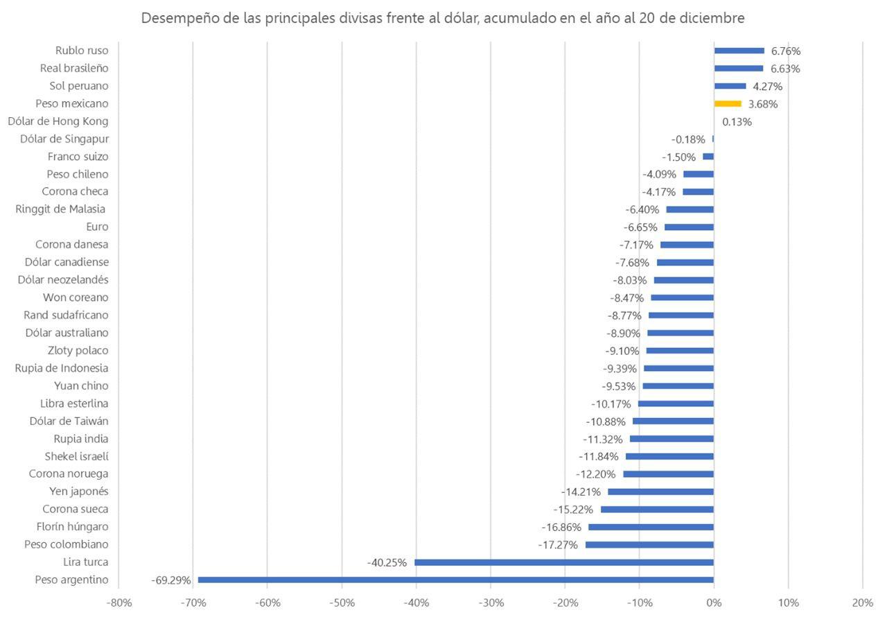 El peso mexicano finalizará el 2022 como una de las cuatro monedas con mejor desempeño frente al dólar, con una apreciación de 3.67 por ciento, por debajo del rublo ruso (6.76 por ciento), real brasileño (6.63 por ciento) y el sol peruano (4.27 por ciento).