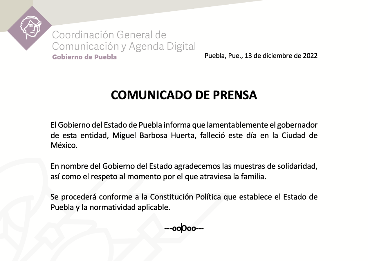 Este 13 de diciembre a las 15:30 horas se dio a conocer oficialmente la muerte del gobernador, Miguel Barbosa.