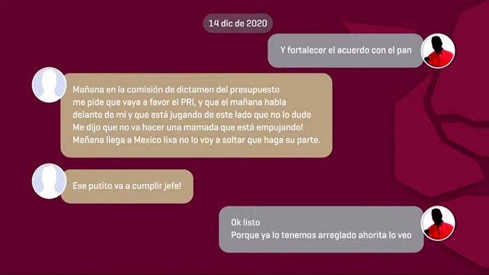 Pablo: Mañana en la comisión del dictamen del presupuesto me pide que vaya a favor del PRI y que él mañana habla delante de mi y que está jugando de este lado, que no lo dude. Me dijo que no va a hacer una mamada, que está empujando. Mañana llega a México lixa, no lo voy a soltar hasta que haga su parte.