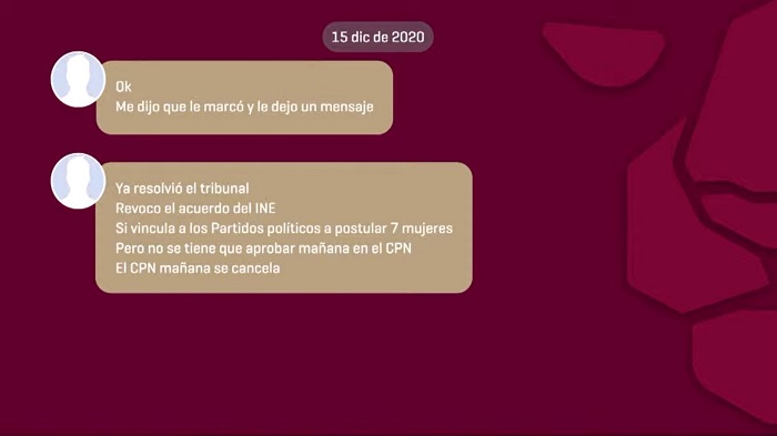 Pablo: Ok, me dijo que le marcó y le dejó un mensaje. Ya resolvió el Tribunal, revocó el acuerdo del INE. Sí vincula a los partidos políticos a postular 7 mujeres, pero no se tiene que aportar mañana en el CPN. El CNP mañana se cancela.