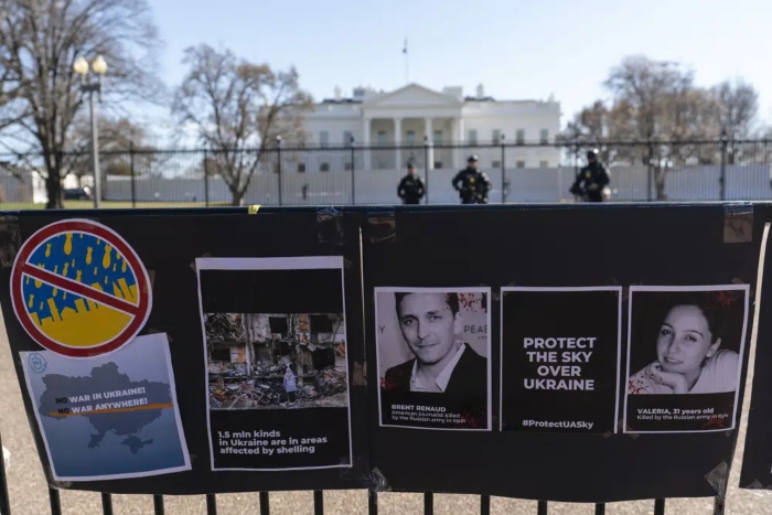 Carteles e imágenes de personas fallecidas, incluido el periodista Brent Renaud, se muestran en una valla durante una protesta contra la invasión rusa de Ucrania en el parque Lafayette, cerca de la Casa Blanca, el domingo 13 de marzo de 2022 en Washington. Foto: Alex Brandon, AP. Expediente.
