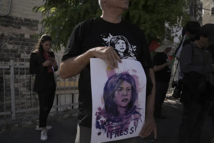 Un manifestante sostiene un cartel de la periodista palestina-estadounidense Shireen Abu Akleh cerca del Hospital Augusta Victoria, en el este de Jerusalén, antes de la visita del Presidente de los Estados Unidos, Joe Biden, el viernes 15 de julio de 2022. Foto: Maya Alleruzzo, AP.