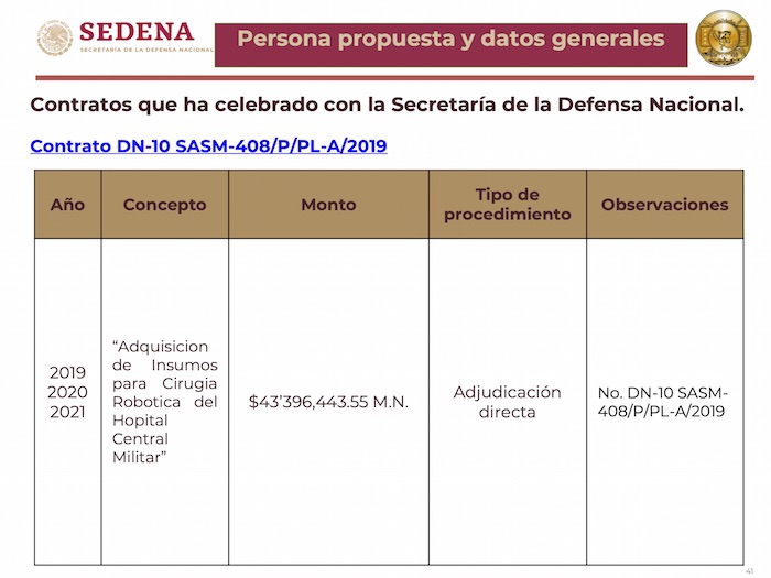 Cuatro meses y 13 días después, la Sedena puso sobre la mesa del Comité de Adquisiciones un contrato de 36 millones 117 mil 422 pesos por Adjudicación Directa para Cyber Robotic para la compra de insumos para cirugía robótica en el Hospital Central Militar.