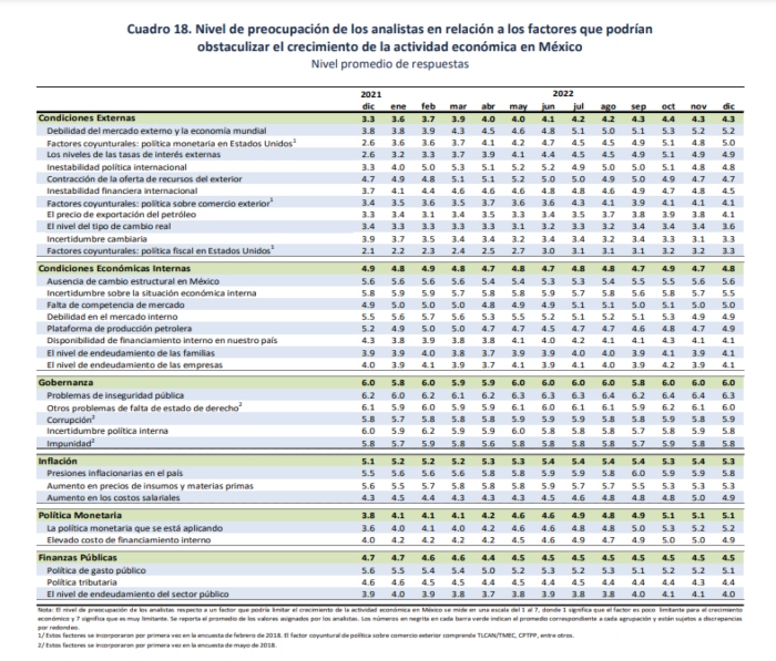 En esta encuesta de diciembre 2022, los especialistas consideran que, a nivel general, los principales factores se asocian con la gobernanza (44 por ciento) y la inflación (15 por ciento), y detallaron que a nivel particular los principales factores son: los problemas de inseguridad pública y las presiones inflacionarias en el país (con 18 y 12 por ciento de las respuestas, respectivamente); problemas de falta de estado de derecho (11 por ciento de las respuestas): la incertidumbre política interna (9 por ciento de las respuestas); y finalmente la política monetaria que se está aplicando (9 por ciento de las respuestas).