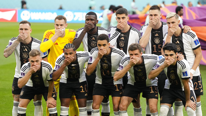 En respuesta, los jugadores de la selección de Alemania se taparon la boca en la foto de equipo antes de su primer partido en el Mundial para protestar contra las acciones de la FIFA acerca de sus planes de portar un brazalete antidiscriminación contra la anfitriona Qatar.