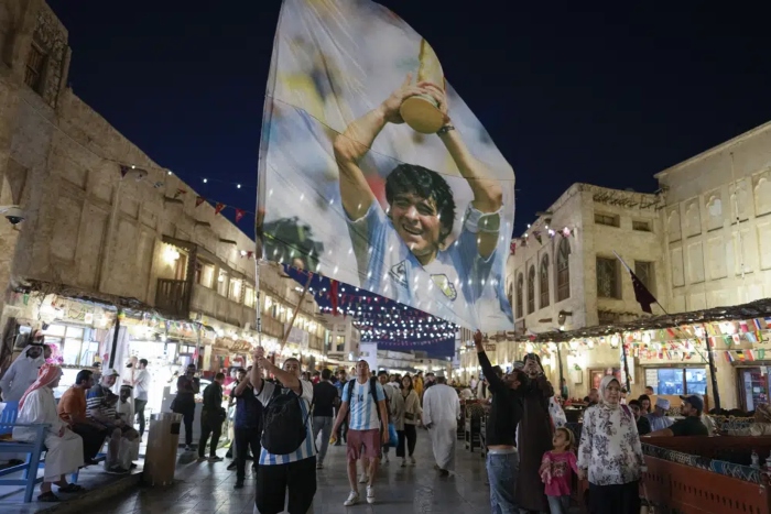 Un aficionado de Argentina agita una bandera con la imagen de Diego Maradona en el mercado de Souq Waqif en Doha, Qatar, el jueves 15 de diciembre de 2022. Argentina enfrentará a Francia en la final del Mundial. Foto: Andre Penner, AP.