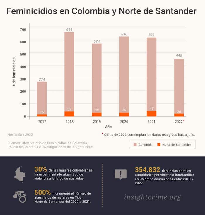 En Colombia, desde el 2017, se han reportado un promedio de 553 feminicidios por año, según cifras del Observatorio de Feminicidios de Colombia de la red Feminista Antimilitarista, aunque hay otras organizaciones que reportan variaciones en estas cifras.