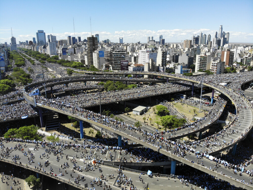 Una muchedumbre ocupa las autopistas a la espera del paso de la selección de Argentina, flamante campeona mundial, el martes 20 de diciembre de 2022, en Buenos Aires. Foto: Mario De Fina, AP.
