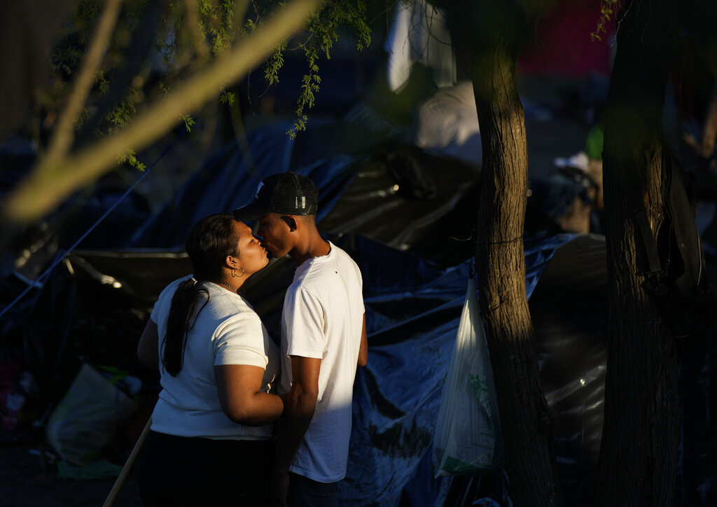 Una pareja de personas venezolanas se besa dentro de su tienda de campaña en un campamento improvisado de migrantes en la orilla de un río en Matamoros, fronteriza con Estados Unidos, el jueves 22 de diciembre de 2022. Foto: Fernando Llano, AP.