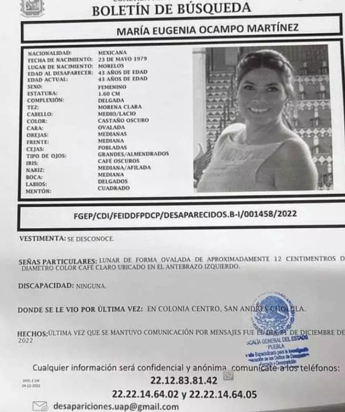 Puebla, 28 de diciembre (Ambas Manos).- María Eugenia Ocampo Martínez, psicóloga originaria de Morelos, desapareció en Puebla hace siete días. La última vez que se comunicó fue la noche del 21 de diciembre; al siguiente día viajaría a San Andrés Calpan y luego llegaría con su familia.