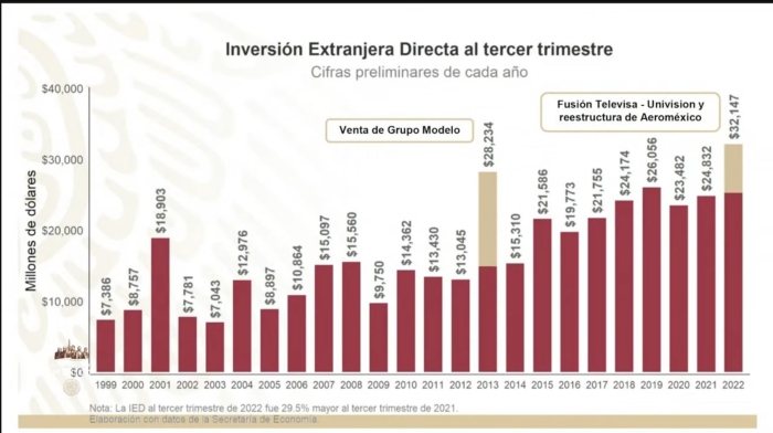 En la Inversión Extranjera Directa (IED), la cual "tiene que ver mucho con el Tratado México, Estados Unidos y Canadá (T-MEC)" comentó que la cifra también es "récord" al registrar 32 mil 147 millones de dólares.