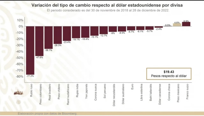 En cuanto al tipo de cambio, es decir, de cómo está el peso con relación al dólar, el mandatario dijo que los datos presentados eran "excepcionales, únicos", algo que "no se veía en 50 años", ya que el peso "es la segunda moneda más apreciada con relación al dólar". La primera es el franco suizo.