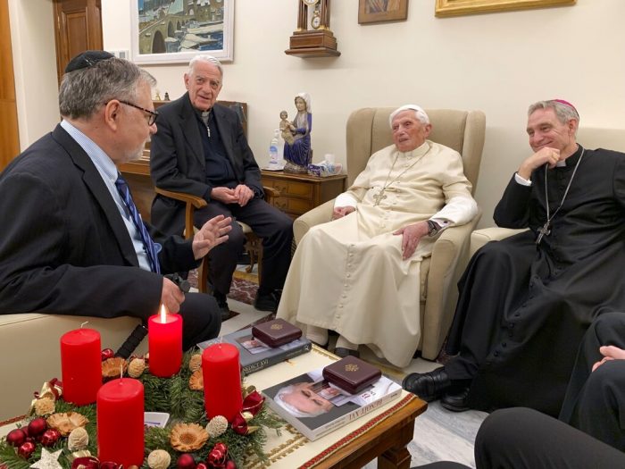 Una de las últimas fotos del Papa emérito Benedicto XVI con vida, siendo tomada el 1 de diciembre de 2022 junto con los ganadores del Premio Ratzinger 2022, Joseph Halevi Horowitz Weiler, a la izquierda, y el padre Michel Fedou, parcialmente oculto a la derecha, en el monasterio Mater Ecclesiae dentro del Vaticano donde vivía el expapa. Foto, Fundación Vaticana J. Ratzinger vía AP)