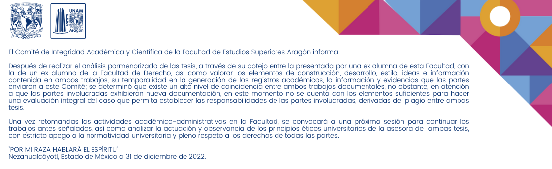 UNAM-TESIS-ESQUIVEL"Ante estos hechos contradictorios y sin tener la certeza de la dimensión del plagio expresado en el testimonio del exalumno de la tesis de 1986, resulta evidente que es necesario recabar información adicional para profundizar en el análisis documental y, de ser el caso, llamar a las partes involucradas", detalló en el punto cuatro del desplegado y confirmó que, de acuerdo con el comunicado del Comité de la FES Aragón, "una vez retomadas las actividades académico-administrativas, convocará a una próxima sesión para continuar con su trabajo, allegándose de las opiniones técnicas que requiera, así como para analizar la actuación de la Directora de ambas tesis, en estricto apego a la normatividad universitaria".