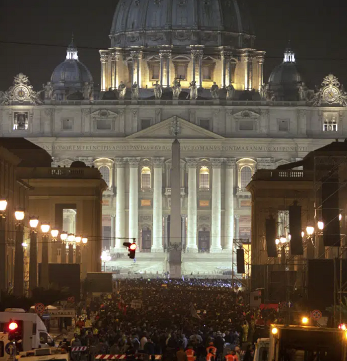 Los dolientes llenan la Plaza de San Pedro, en el Vaticano, la madrugada del miércoles 6 de abril de 2005, mientras esperan entrar a la Basílica de San Pedro para despedirse personalmente del Papa Juan Pablo II. Foto: Diether Endlicher, AP