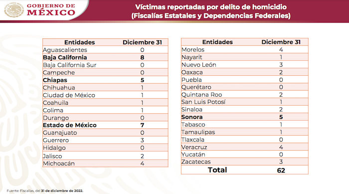 Según estas cifras preliminares, el 31 de diciembre de 2022 se contabilizaron 62 víctimas de homicidios en el país, de los cuales el mayor número de estos delitos tuvieron lugar en Baja California, en donde hubo ocho asesinatos; el Estado de México fue la segunda entidad con más homicidios registrados el sábado con siete víctimas de este delito; en los estados de Chiapas y Sonora hubo cinco asesinatos, respectivamente.