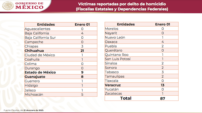 El 31 de diciembre de 2022, de acuerdo con el reporte del conteo diario de asesinatos elaborado por el Gabinete de Seguridad federal del Gobierno de México, en el país se contabilizaron 62 víctimas de homicidios, mientras que este domingo 1 de enero de 2023, se registraron 87 asesinatos en el país, según la misma fuente.