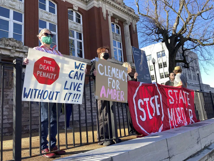 Sue Gibson, a la izquierda, de Jefferson City, y Jay Castilow, de Columbia, sostienen pancartas junto a otras personas frente al edificio del Tribunal Supremo de Missouri mientras protestan por la ejecución de Amber McLaughlin el martes 3 de enero de 2023, en Jefferson City, Mo. McLaughlin fue condenada por el asesinato de Beverly Guenther en 2003. Foto: David A. Lieb, AP