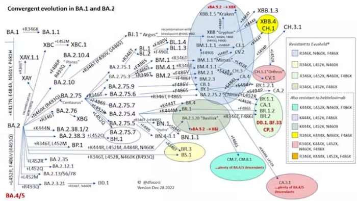 Mapa de evolución convergente del SARS-CoV-2 actualizado el 31 de diciembre de 2022. Foto: Daniele Focosi, TW vía The Conversation.