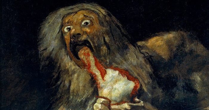 Al devorar a cada uno de sus hijos, Cronos impide que el mundo acontezca, si Zeus el menor de su prole lo mata, acaba con el caos y el tiempo inicia. Inicia la vida y la creación del panteón griego. En el mito la acción es una espiral, ocurre siempre; empieza y termina, pero nunca acaba. Su repetición le permite ser. La actualización del mito es un recordatorio: de dónde venimos y quiénes somos. Nada más espeluznante que "Saturno devorando a su hijo" de Francisco de Goya, una obra expresionista que rompe con la forma pictórica y desata al pathos que todos llevamos dentro. Matar al padre, esa impensable y cruel ejecución, es una celebración de lo irremediable. Es la fuerza suprema como víctima propiciatoria.