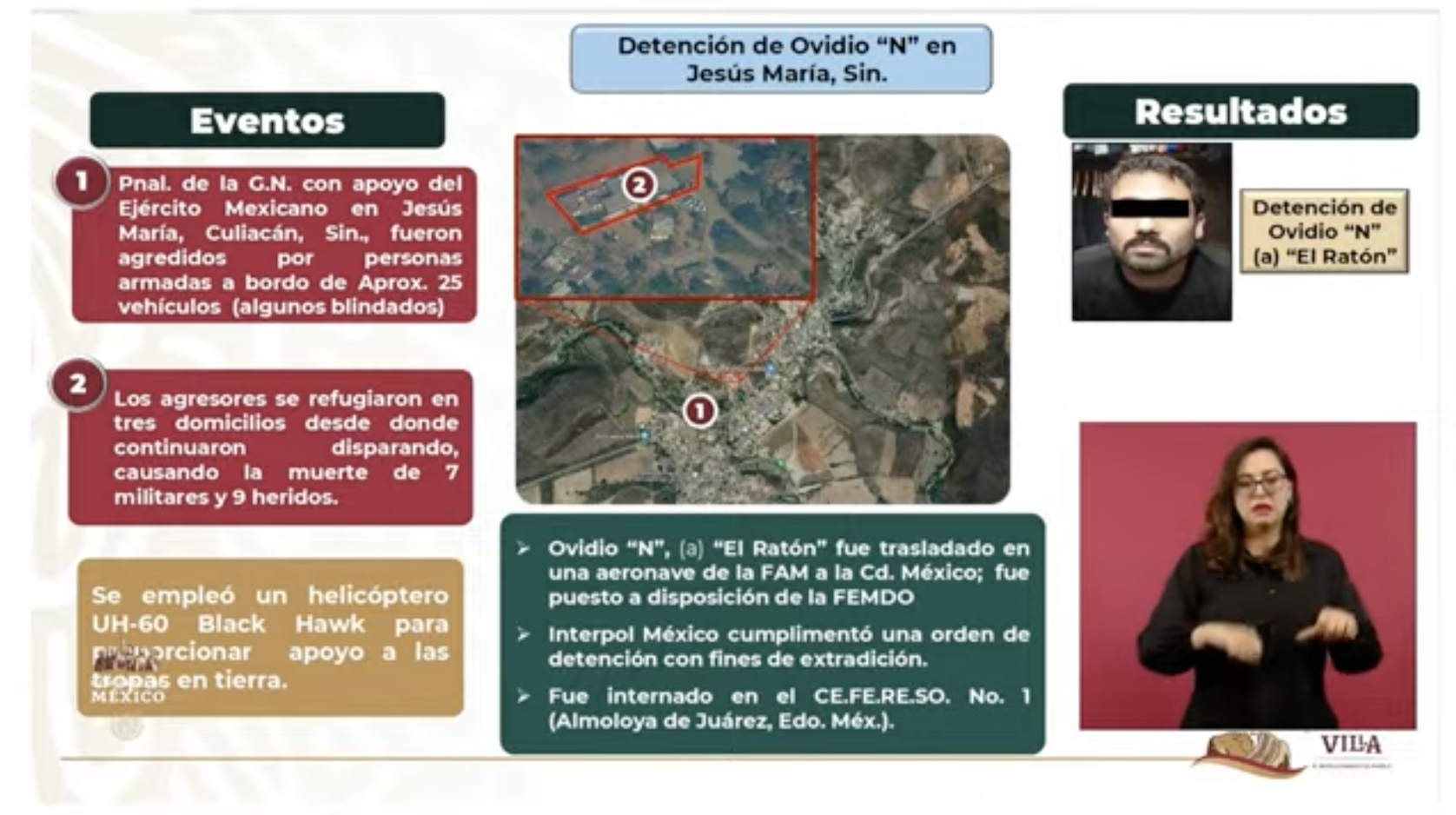 El Secretario de la Defensa Nacional (Sedena), Luis Crescencio Sandoval, dio a conocer todos los detalles del operativo para detener a Ovidio Guzmán López, hijo de Joaquín Guzmán Loera, "El Chapo", y uno de los líderes del Cártel de Sinaloa, que dejó al menos 10 militares –incluido un coronel en una agresión–, así como 19 agresores, muertos, y varios detenidos además de "El Ratón".