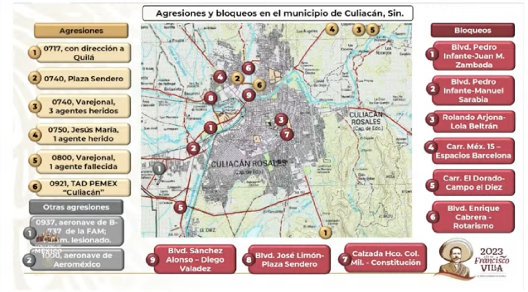 Dos aeronaves, una de la FAM y una de línea comercial –Aeroméxico– recibieron agresiones. En total, fueron nueve bloqueos en la capital sinaloense, incluidas varias arterias principales, como boulevares, calzadas y carreteras de ingreso y salida a la ciudad.