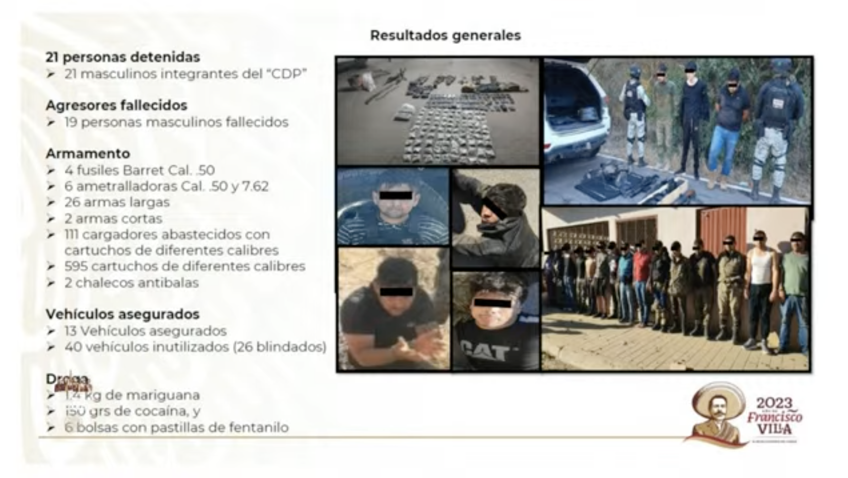 Además, se aseguraron 13 vehículos y 40 automóviles más quedaron inutilizados. De estos últimos, 26 eran blindados. También se requisaron dos kilogramos de mariguana; 150 gramos de cocaína; y seis bolsas con pastillas de fentanilo.