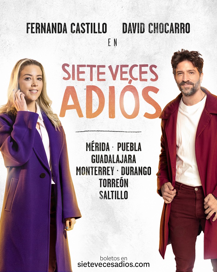 Ciudad de México, 8 de enero (SinEmbargo).- La puesta en escena Siete Veces Adiós tendrá como protagonistas a Fernanda Castillo y David Chocarro en la primera parte de la gira que visitará Mérida, Puebla, Guadalajara, Monterrey, Durango, Torreón y Saltillo, en enero y febrero de este 2023.