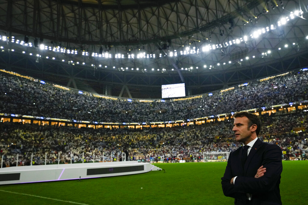 El Presidente de Francia, Emmanuel Macron, ingresa en la cancha tras la derrota de la selección de su país ante Argentina en la final de la Copa del Mundo, el domingo 18 de diciembre de 2022, en Lusail, Qatar Foto: Petr David Josek, AP.