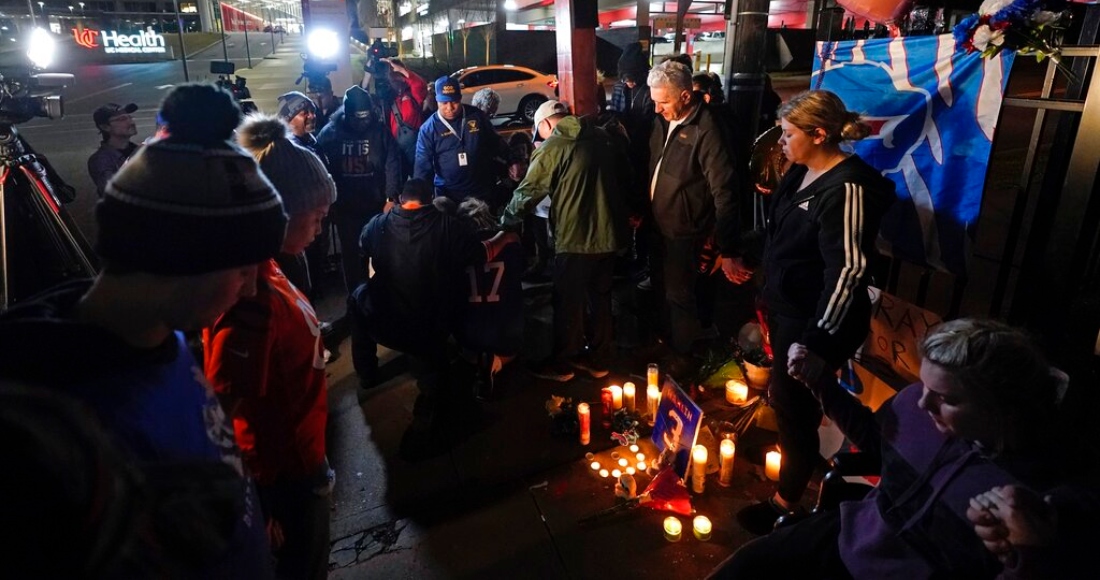 Mensajes de aliento para el jugador de los Bills de Buffalo, Damar Hamlin, en las rejas del US Medical Center, donde el safety permanecía internado. Foto: Joshua A. Bickel, AP