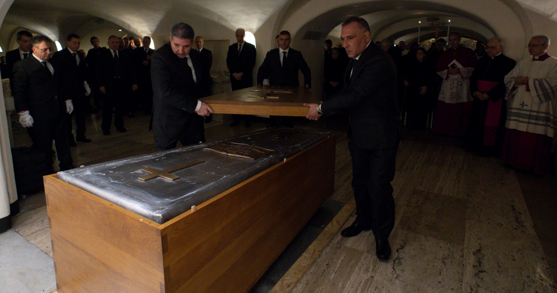Los restos fueron colocados en la antigua tumba del predecesor de Benedicto, Juan Pablo II, cuyos restos fueron trasladados a una capilla en el piso principal de la basílica luego de su beatificación en 2011.