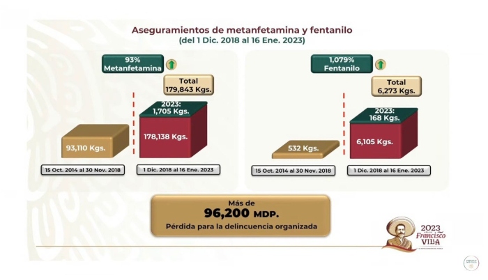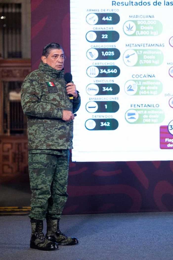 Además, detalló que del 3 al 16 de enero las autoridades han confiscado 168 kilogramos de fentanilo, los cuales corresponden a 167.8 millones de dosis. En cuanto a la metanfetamina, el titular de la Sedena informó que hasta la fecha se han decomisado 179 mil 843 kilogramos, es decir, un 93 por ciento más que en el Gobierno anterior.