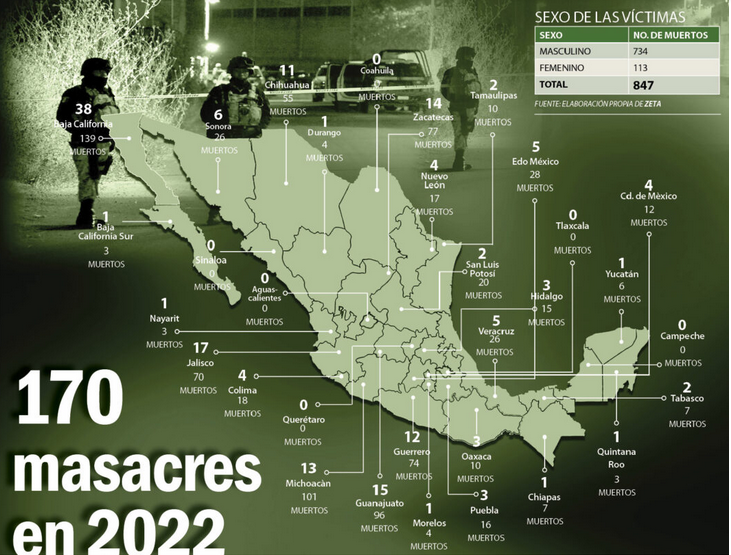 Cabe mencionar que de las 847 personas que perdieron la vida en estas masacres, 734 eran hombres y 113 mujeres. Del total, al menos 32 menores de edad. Durante los mismos atentados resultaron heridas 92 personas. En el caso de BC, los muertos en los 38 actos violentos fueron 139, mientras que en 2021, en otro recuento de ZETA, se contaron 13 masacres con 47 defunciones.