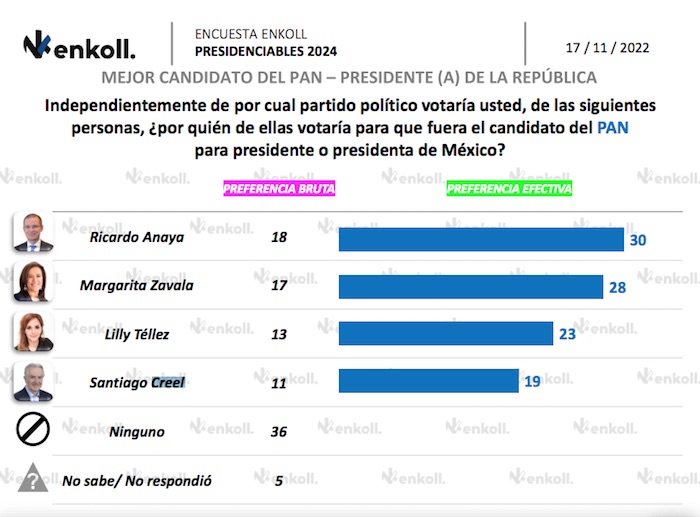 Los números de esta medición muestran que Senadora cuenta con el 29 por ciento de la opinión favorable entre el electorado, le sigue la Diputada Margarita Zavala con el 26 por ciento, el Alcalde emecista Luis Donaldo Colosio con un 25 por ciento, mismo nivel que obtuvieron los priistas Enrique de la Madrid y Claudia Ruiz Massieu. Mientras que Beatriz Paredes registró el 24 por ciento de opiniones positivas y Santiago Creel alcanzó el 22 por ciento.