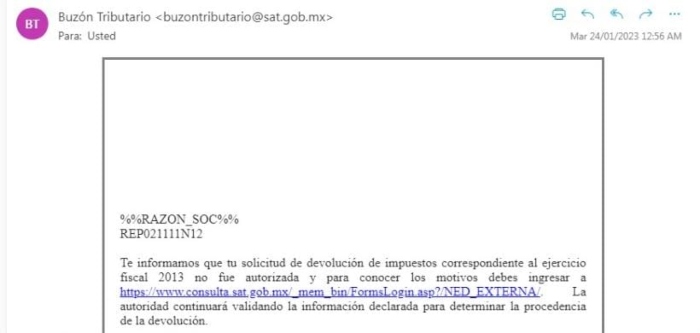 Culiacán, 24 de enero (Río Doce).-- Contribuyentes denunciaron haber recibido un correo electrónico del Sistema de Administración Tributaria (SAT) en el que les niegan la devolución de impuestos de 2013, correo que es enviado por el buzón tributario del SAT con una liga a la que le pide al usuario ingresar.