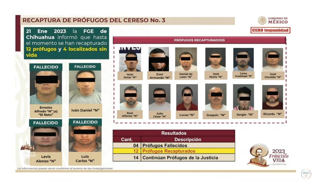 Ciudad de México, 26 de enero (SinEmbargo).- Luis Rodríguez Bucio, Subsecretario de Seguridad Pública y Protección Ciudadana federal, informó que 12 de los 30 reos que se fugaron del Centro de Reinserción Social (Cereso) número 3, ubicado en Ciudad Juárez, Chihuahua, el pasado 1 de enero durante un violento motín, han sido recapturados.