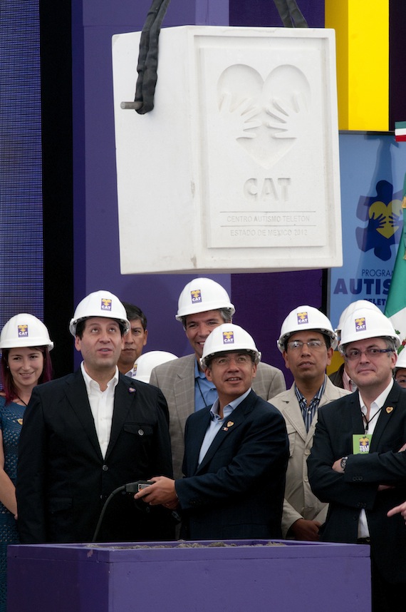 El presidente Felipe Calderón acciona la grúa en el nuevo Centro Autismo Teletón en el Municipio de Ecatepec, donde el pasado 15 de marzo de este año se puso la primera piedra junto con el gobernador del Estado de México, Eruviel Avila y Fernando Landeros, director general del TELETON.