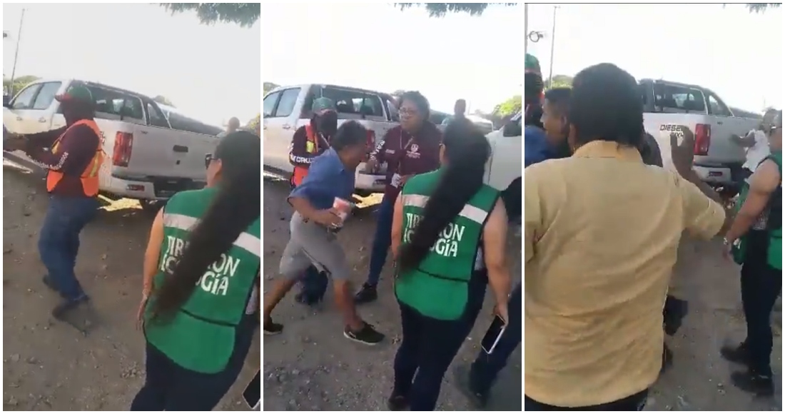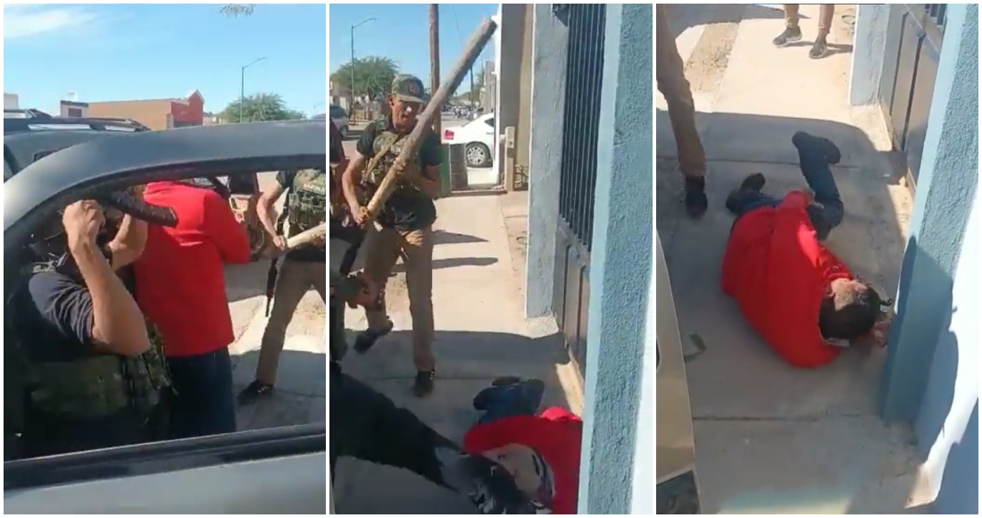 En la grabación se observa cuando dos hombres que portan armas de grueso calibre, quienes habrían interceptado y bajado de una camioneta al taquero identificado como Matías, lo golpean con las armas y una tabla.