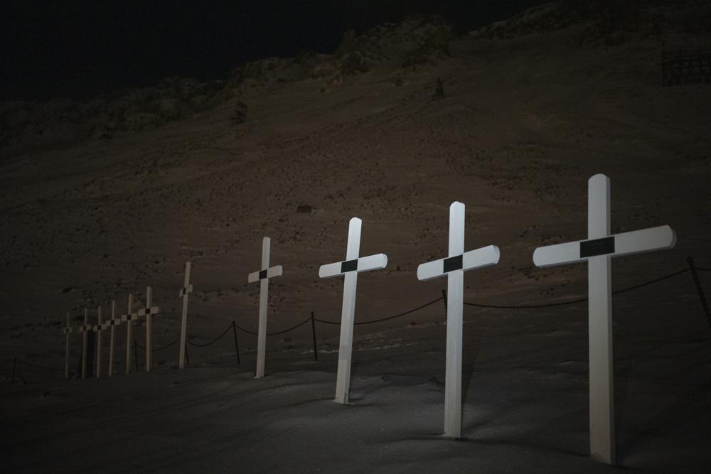 La historia de la minería y sus peligros están grabados en la ladera de la montaña en Longyearbyen. Debajo de las torres transportadoras de carbón abandonadas en un día de mediados de enero, un rastro de huellas en la nieve conducía a un monumento conmemorativo que nombra a los 124 mineros que han muerto en el trabajo desde 1916, iluminado en la oscuridad constante de la noche polar de invierno.