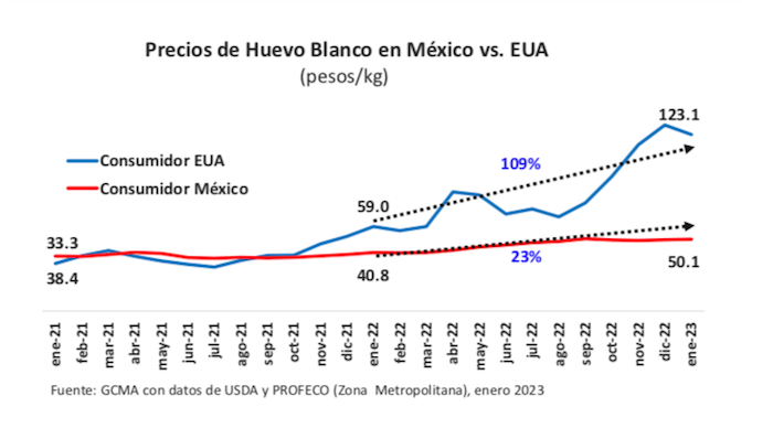 Al respecto de esta problemática en Estados Unidos, el Grupo Consultor de Mercados Agrícolas (GCMA) informó que en sólo un año, de enero del 2022 a enero del 2023, el huevo presentó un incremento en el precio de este alimento del 109 por ciento, al pasar de 59 pesos por kilogramo de este alimento, en enero de 2022, a 123 pesos por kilogramo que es como se oferta actualmente al público en general.