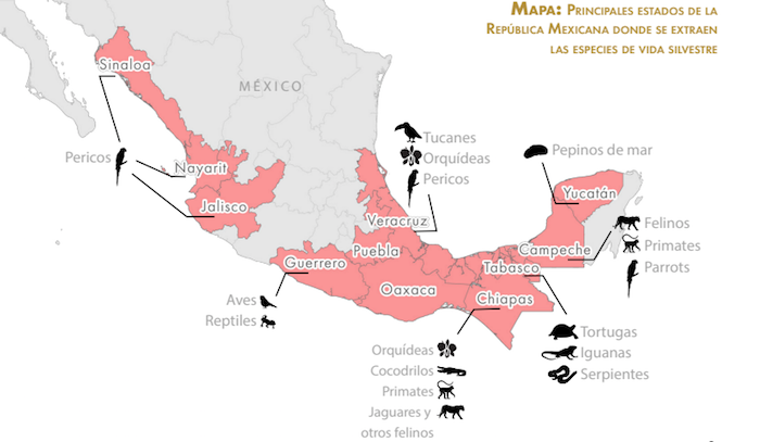 La Procuraduría Federal de Protección al Ambiente (Profepa) dio a conocer, a través de la solicitud de información con folio 330024422000586, que los principales estados en los que se presenta la recolección ilegal de vida silvestre son Campeche, Chiapas, Tabasco, Yucatán, Veracruz, Oaxaca, Guerrero, Puebla, Jalisco, Nayarit y Sinaloa.