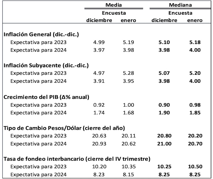 Especialistas financieros del sector privado consultados por Banxico prevén una inflación del 5.19 por ciento y un crecimiento económico de 1 por ciento para 2023. Imagen: Banxico.