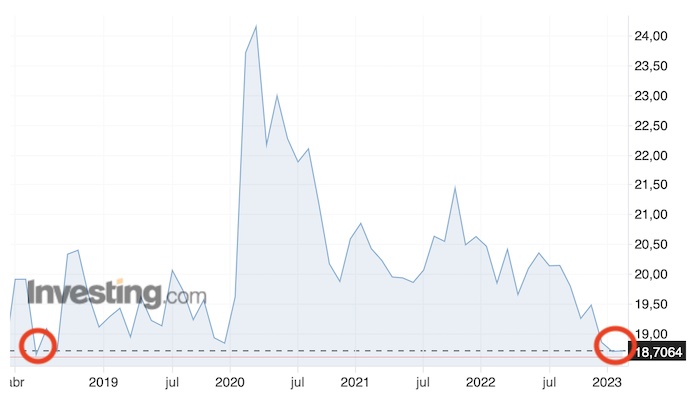 Comportamiento del peso de 2018 a 2023 con un pico en 2020 por la pandemia. Imagen: Investing.